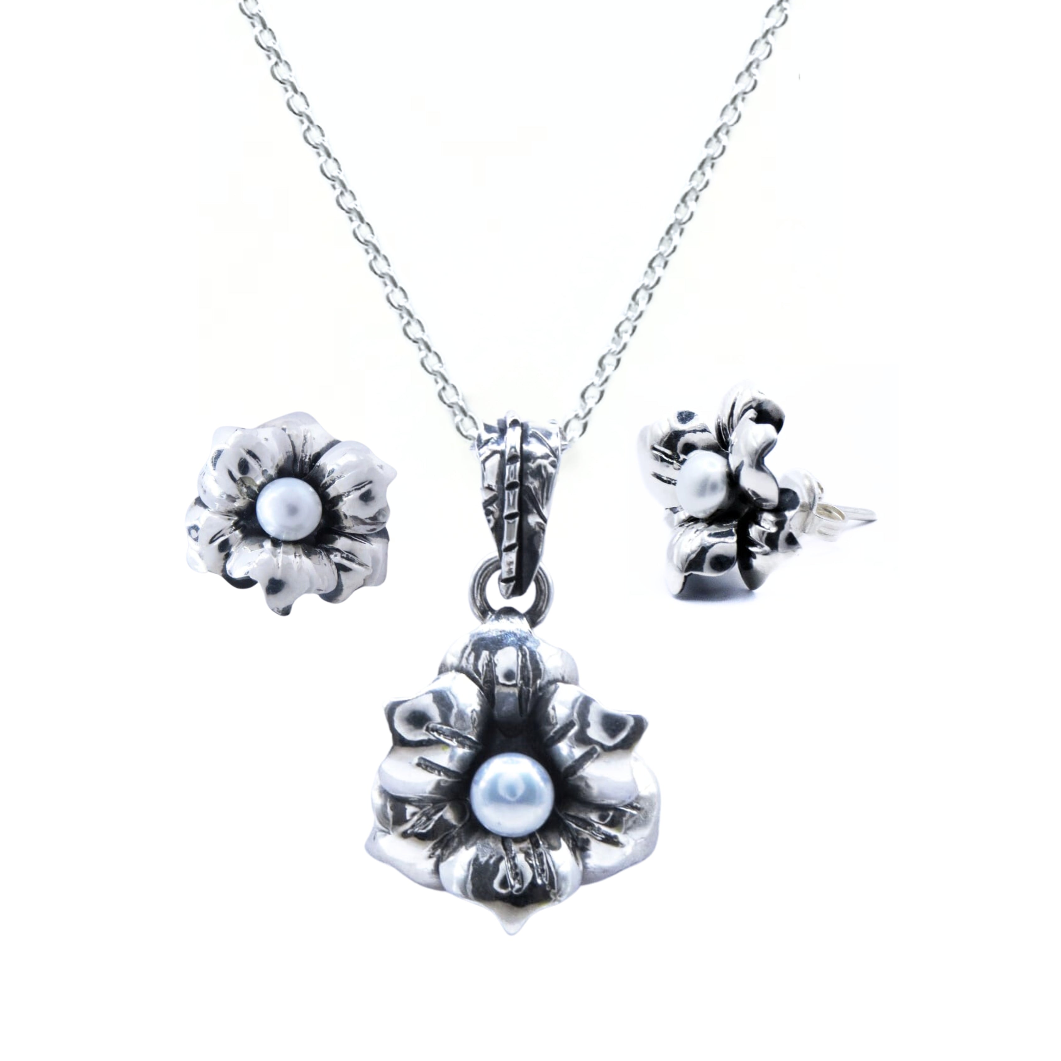 Aretes y Dije Plata Primera Ley 0.925 Lotus Perla incrustada. - Colección Lotus – Collares y Dijes