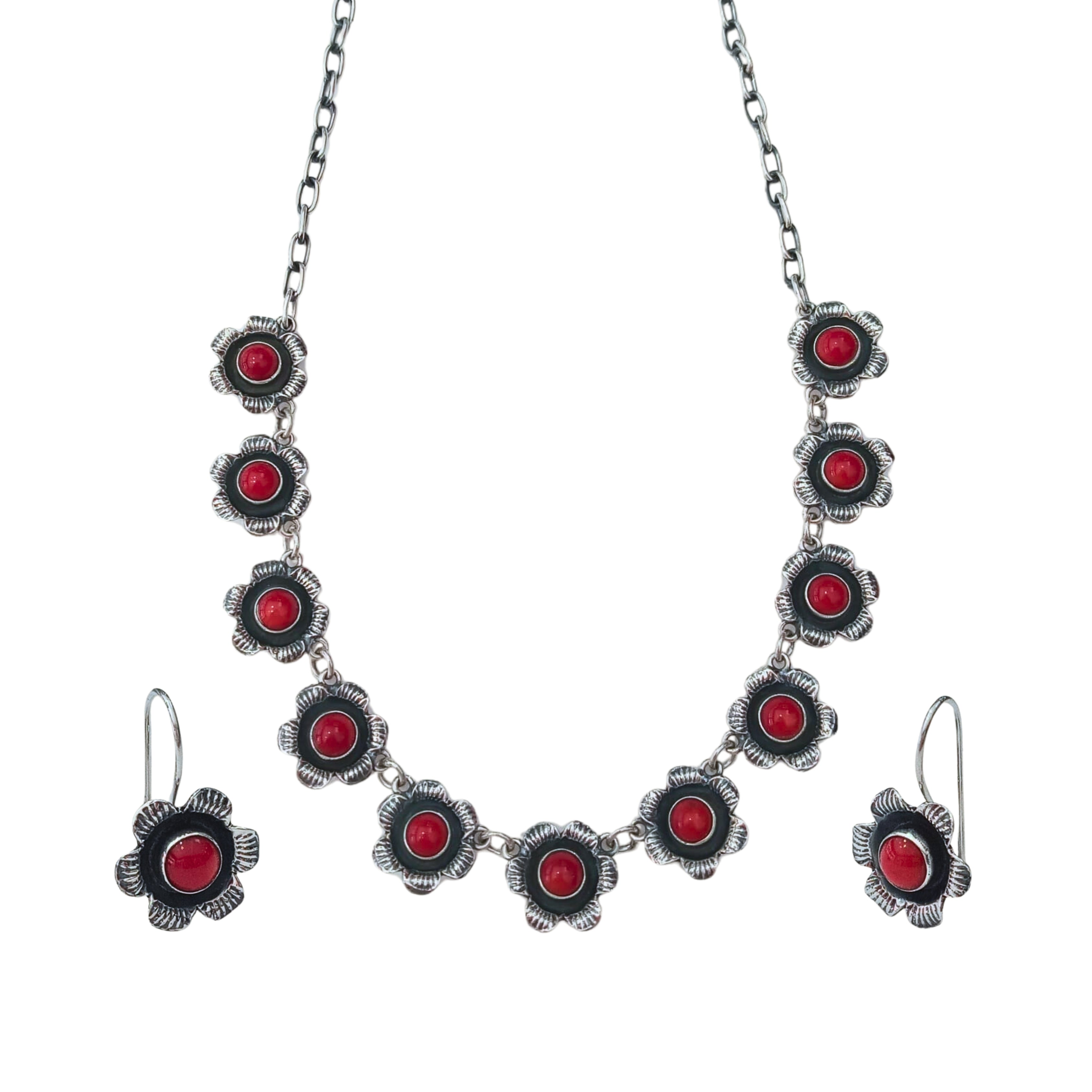 Embellece tu look con la sofisticación vibrante de este collar de flores, donde un cautivador coral en el centro añade un toque de calidez y energía. Las delicadas flores de plata realzan la intensidad del coral, creando una joya que combina elegancia y vitalidad. Ideal para quienes desean llevar consigo un toque de color y distinción, este collar es un verdadero tributo a la belleza y el estilo inigualable.