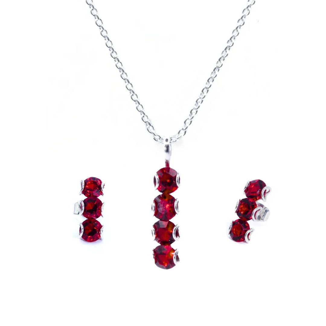 Un diseño que resplandece con fuerza y elegancia. Este juego de aretes y dije se distingue por la armonía de sus zirconias en tono rubí, dispuestos de manera vertical para crear una silueta estilizada y sofisticada.