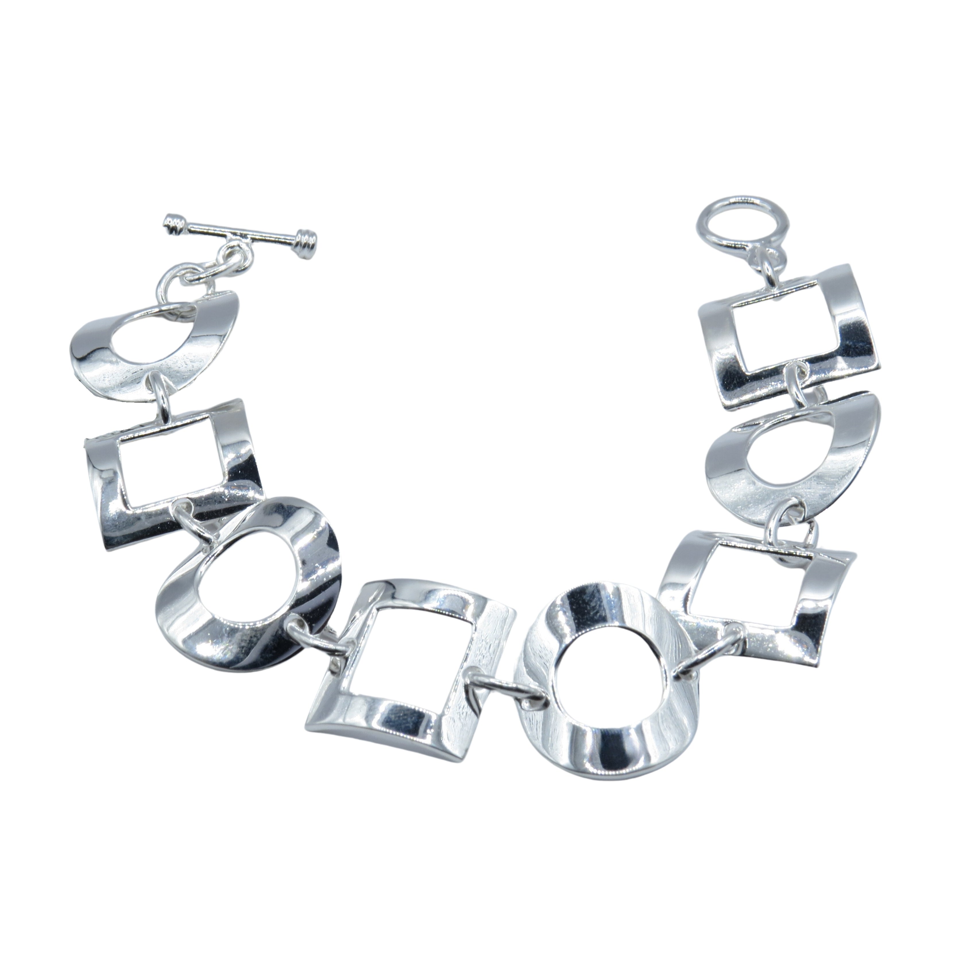 Esta pulsera combina la elegancia de la plata con un diseño contemporáneo de cuadrados y círculos entrelazados. Cada forma geométrica añade un toque de dinamismo y sofisticación, creando una pieza que es tanto moderna como versátil. Ideal para quienes buscan un accesorio que refleje un estilo audaz y vanguardista.