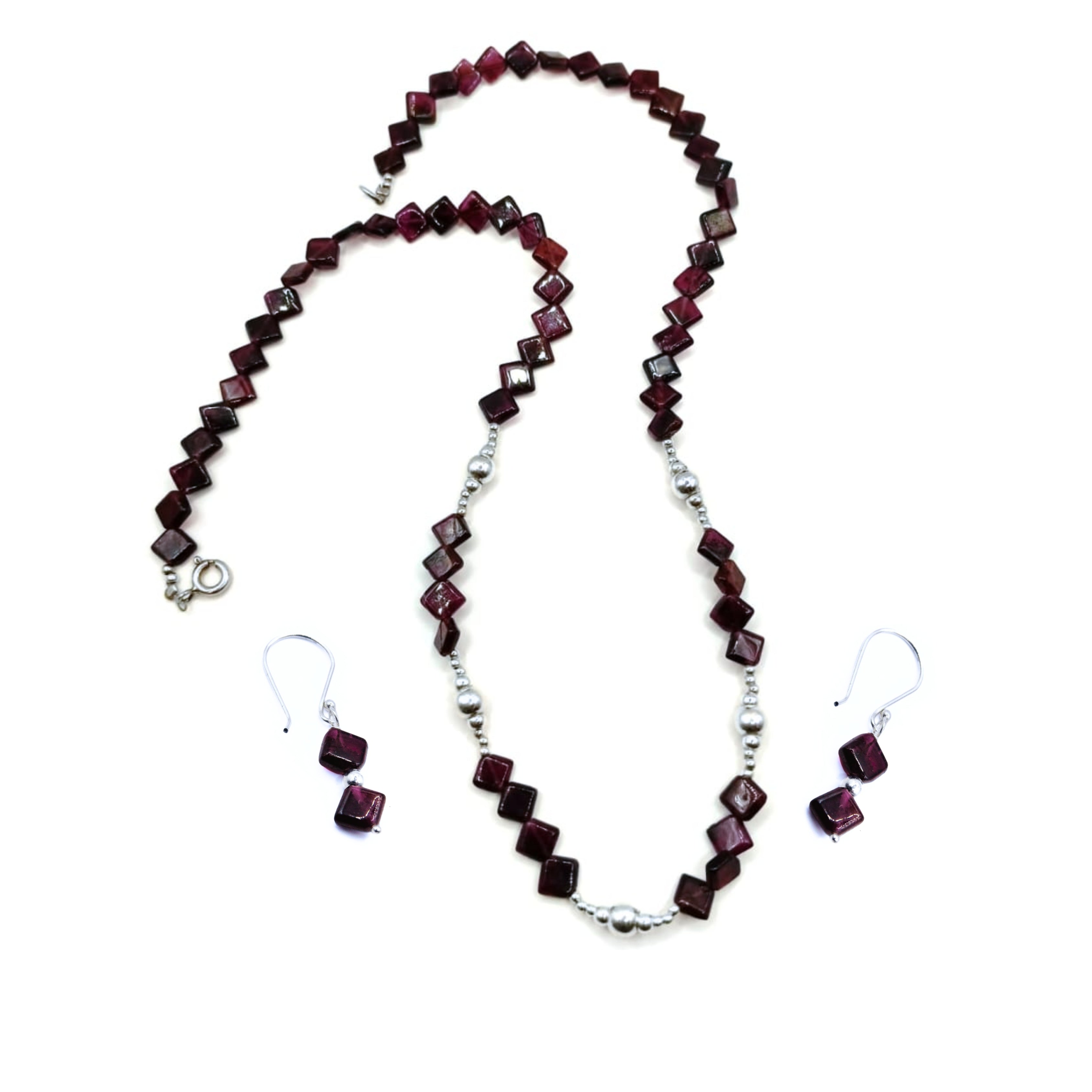 Collar y Aretes Plata Primera Ley 0.925 Tokio granate romboide.