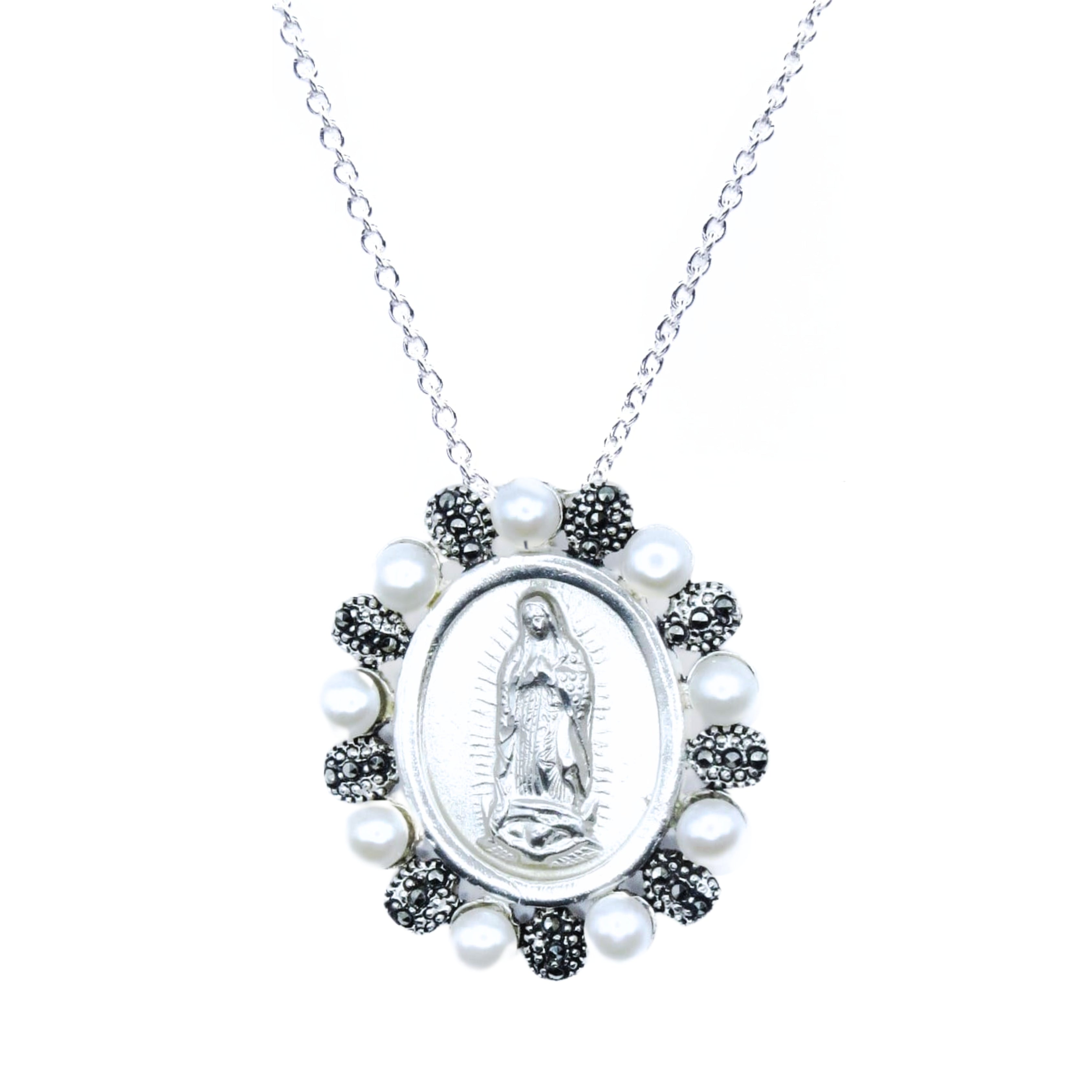 Dije Virgen de Guadalupe Plata Primera Ley 0.925 Ave María Marquesita/Perla - Colección Ave María–Collares y Dijes